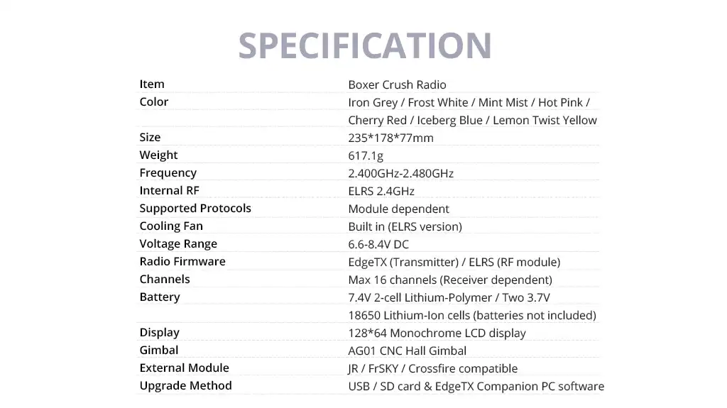 RadioMaster proudly presents the new Boxer Crush! Available in seven stunning colors-' Iron Grey,' 'Frost White,' 'Mint Mist,' 'Hot Pink,' 'Cherry Red,' 'Iceberg Blue,' and 'Lemon Twist Yellow'-each designed to inspire and excite. Equipped with our famous AG01 hall effect gimbals, the Boxer Crush is perfect for those who want to make a bold statement and infuse their flying experience with vibrant color. Stand out and add a touch of personality to your RC adventures with the Boxer Crush from RadioMaster!
